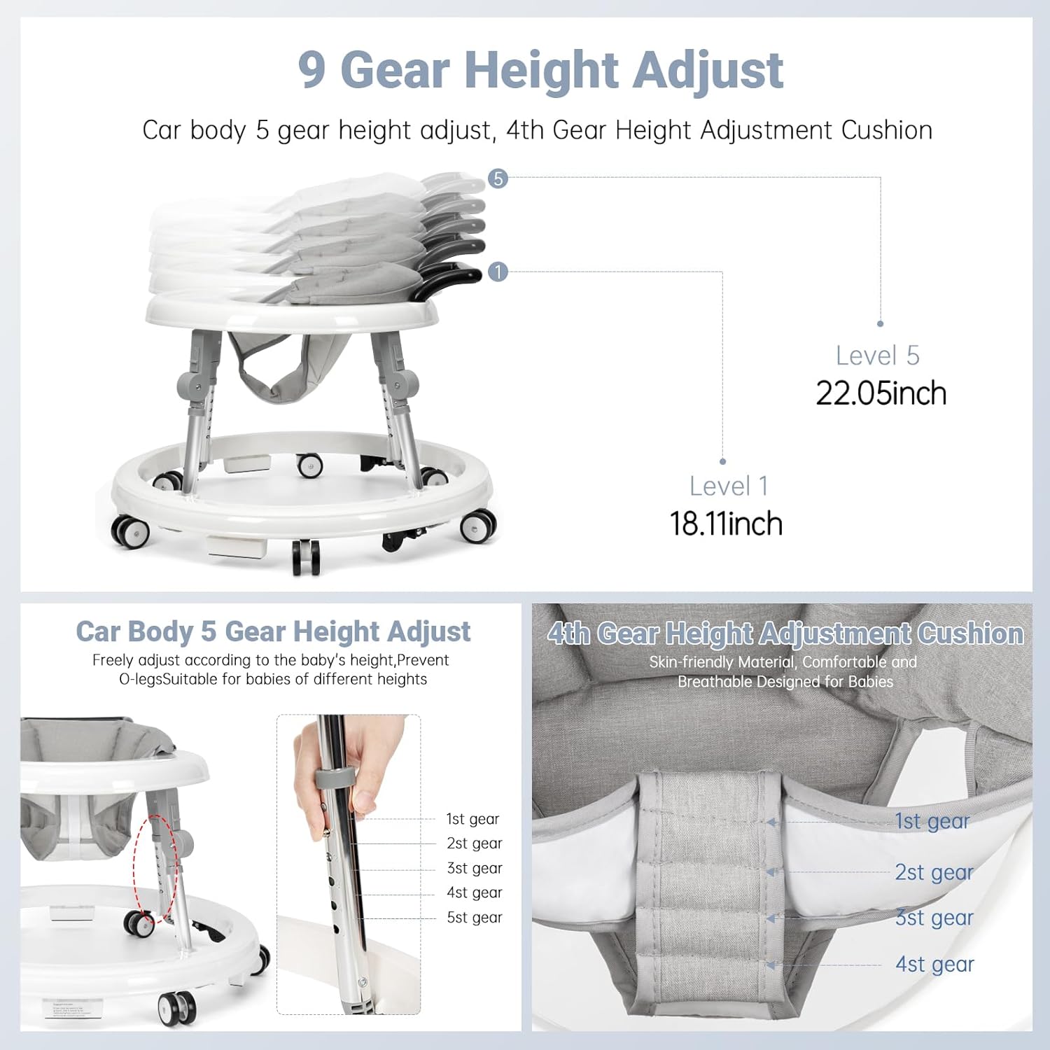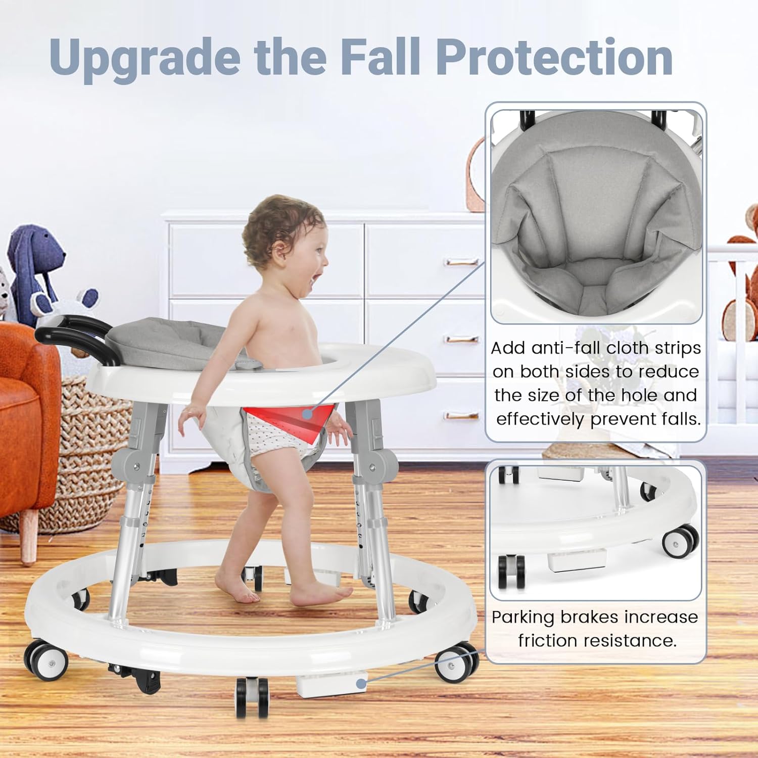 Thanks to 9 adjustable height settings, this walker grows with your child—accommodating stages from 6 to 12 months and helping maintain proper posture and balance with ease.