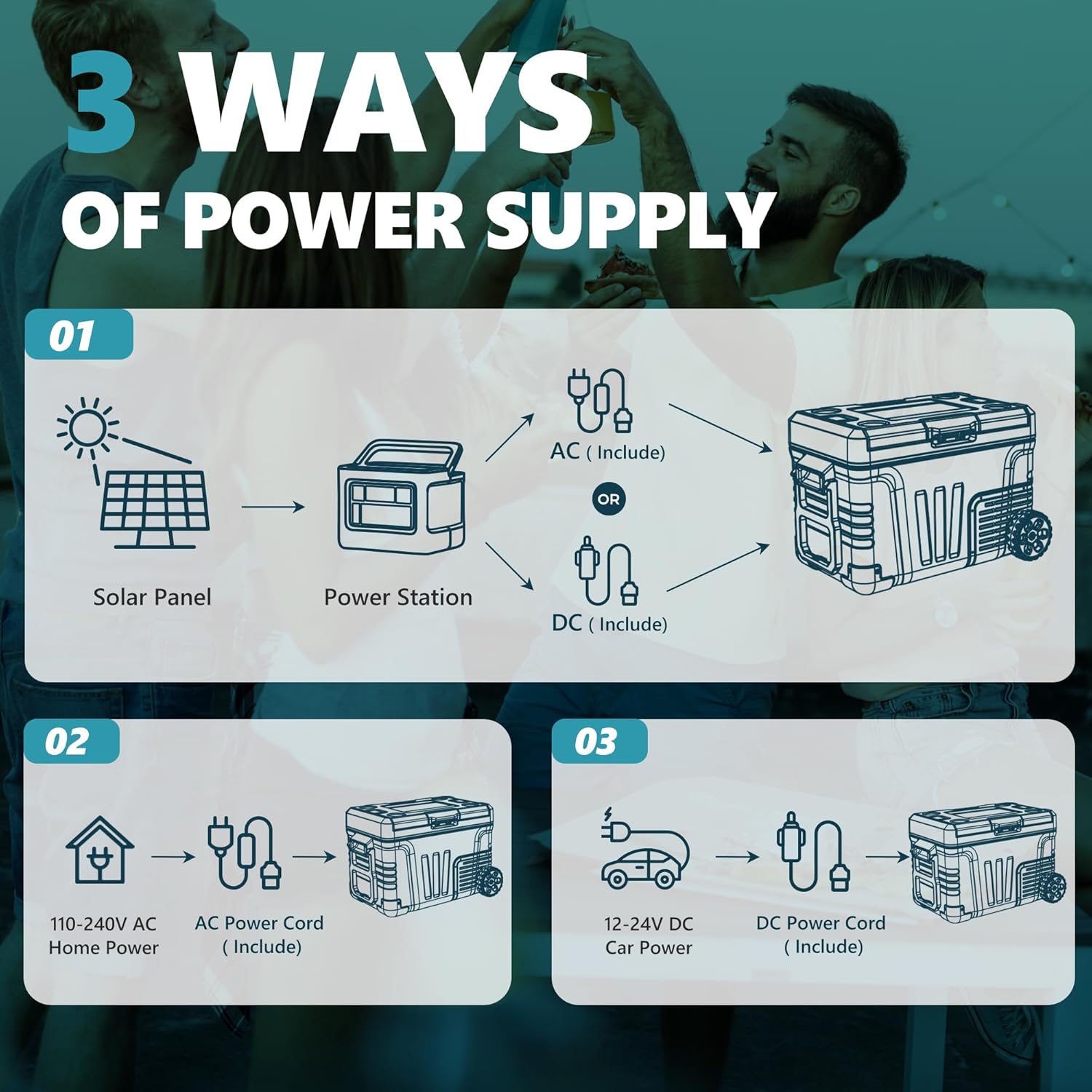 Equipped with both 110–240V AC and 12V/24V DC adapters, the EasyCooler™ works perfectly in your car, RV, or at home.