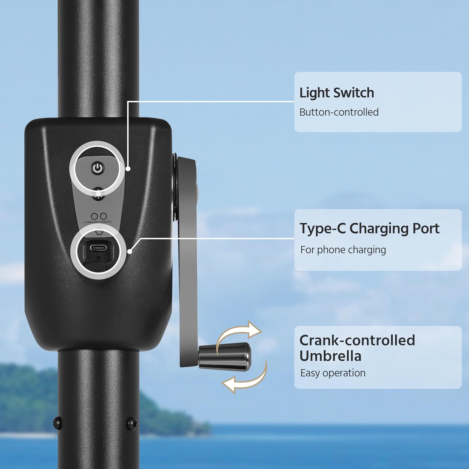 Featuring 36 detachable solar LED strips, this parasol lights up your evenings with customizable color modes—all charged by the sun for eco-friendly night-time ambience.