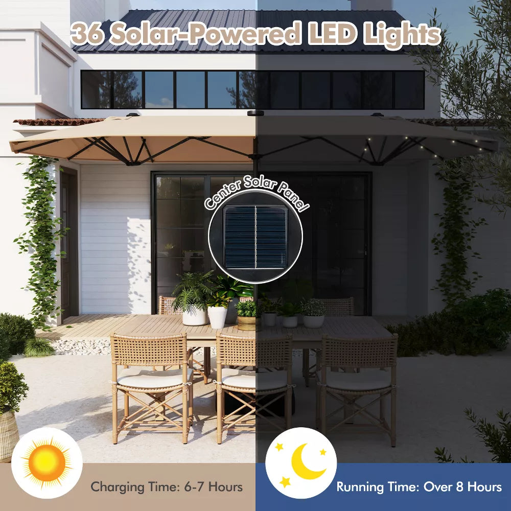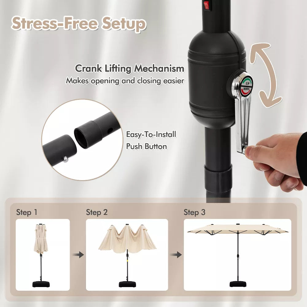 The Parasol™ features a 13ft double-sided canopy, providing expansive shade coverage for your outdoor gatherings. Its generous size ensures comfort for multiple people, making it perfect for patios, gardens, and commercial spaces.